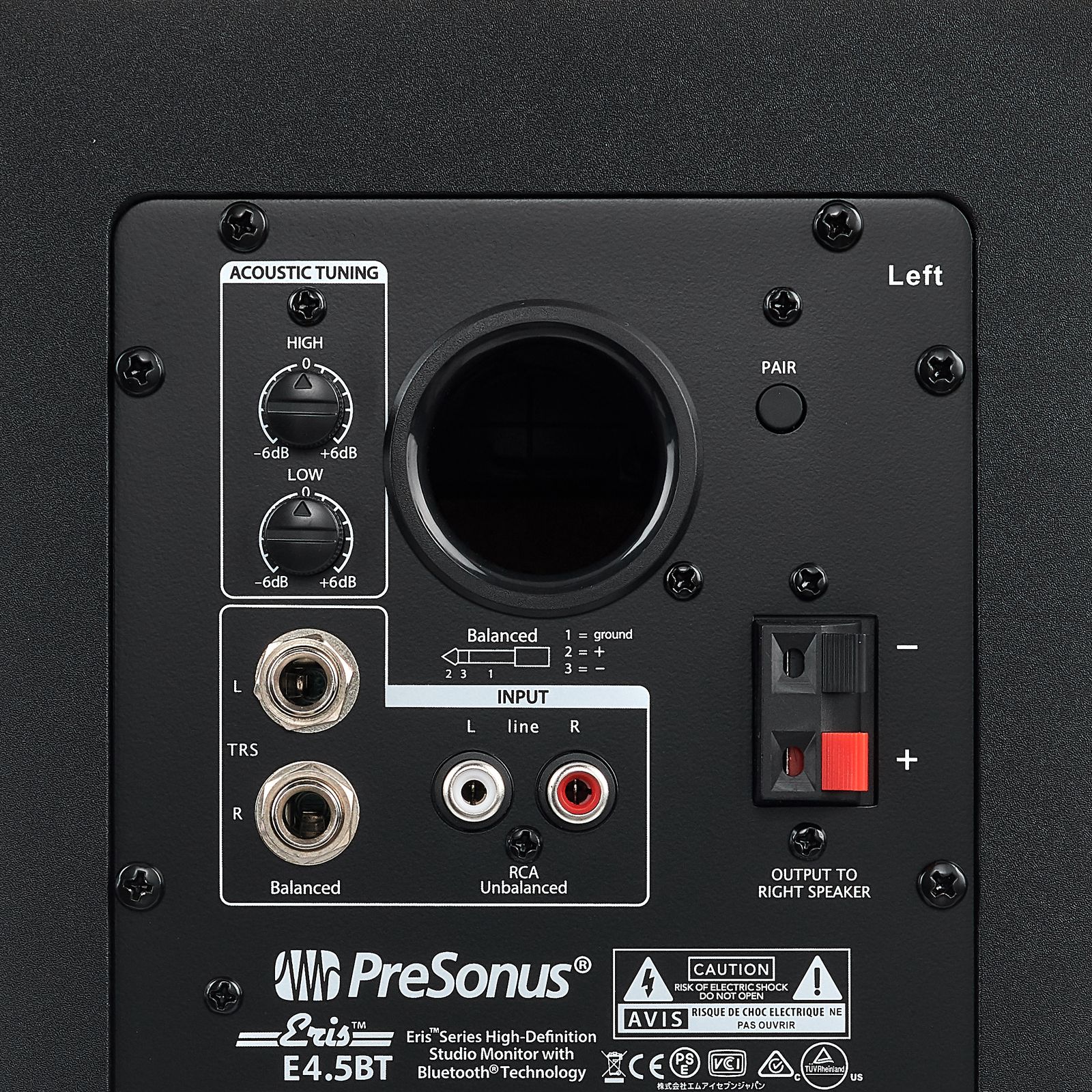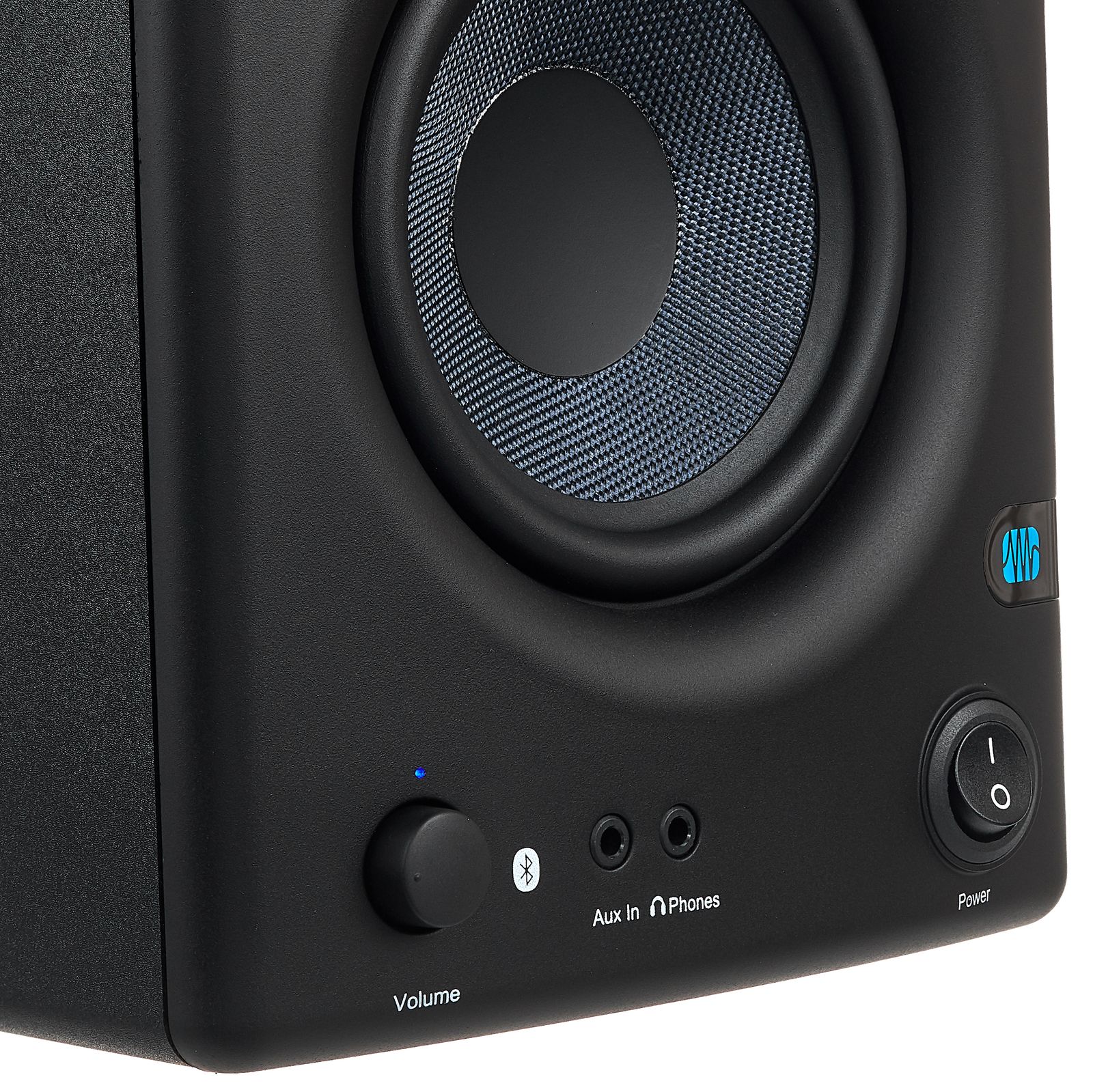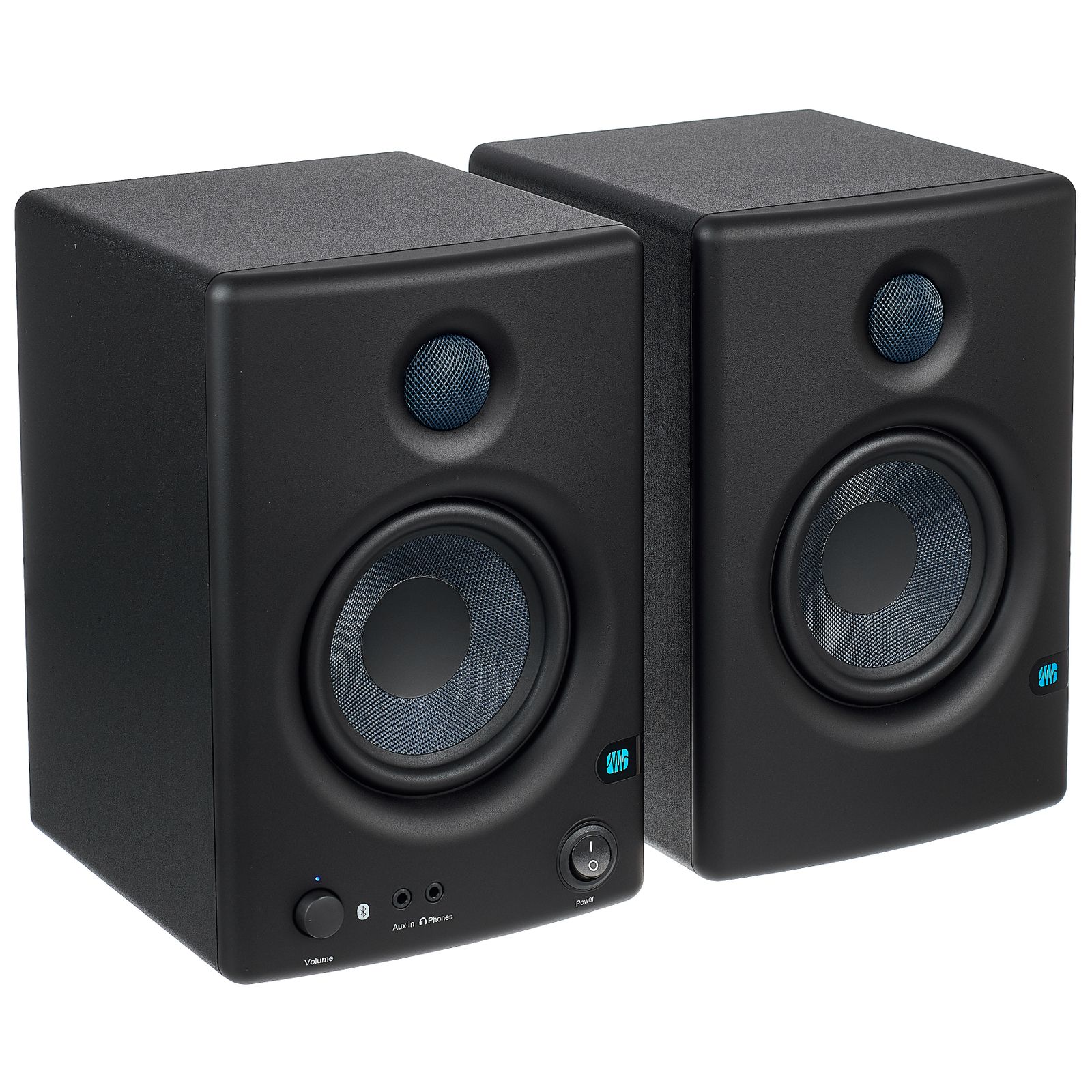 The Presonus Eris E4.5 BT is fitted with a carefully designed and solidly built bass reflex cabinet made of vinyl-laminated MDF. As with all the Eris models, the woofers are made of Kevlar, producing a clean and precise bass response and even diffusion through all the lower frequencies (here from 70 Hz upwards). Similarly, the silk dome tweeter reproduces all the high frequencies in a very natural way and provides a wide sweet spot in the listening position. Each speaker is powered by a 25-watt class AB amplifier, and both amplifiers are located in the left speaker, the front panel of which also features a convenient headphone output.