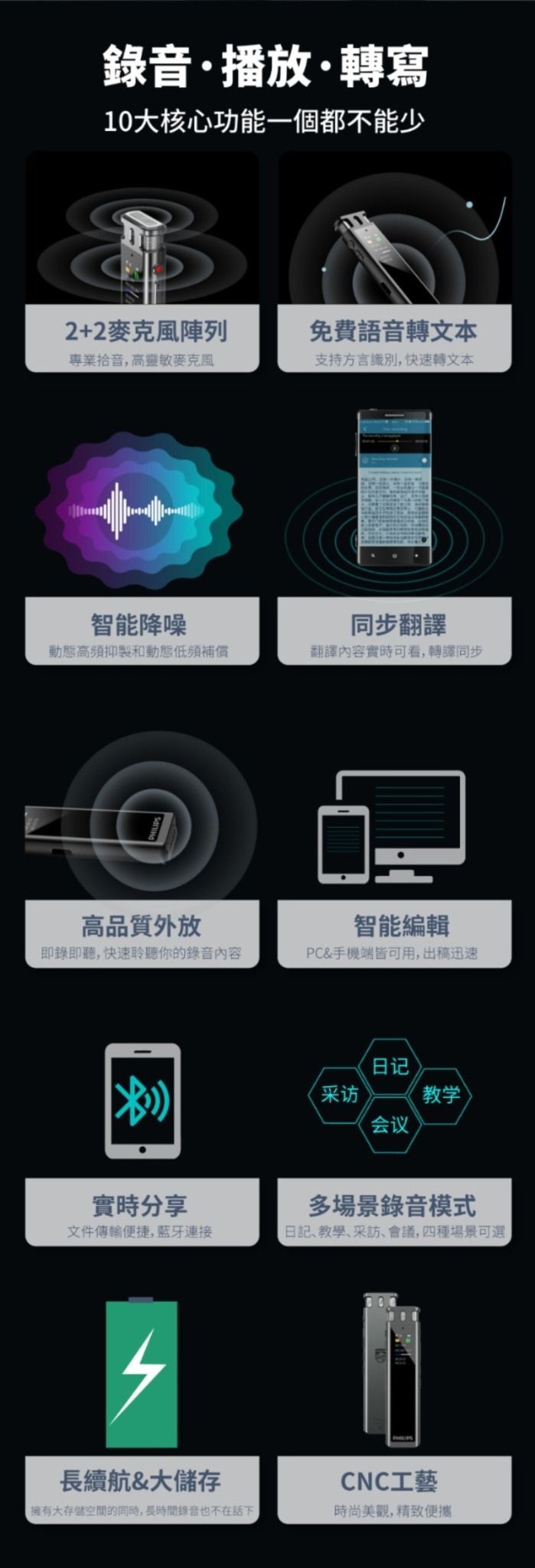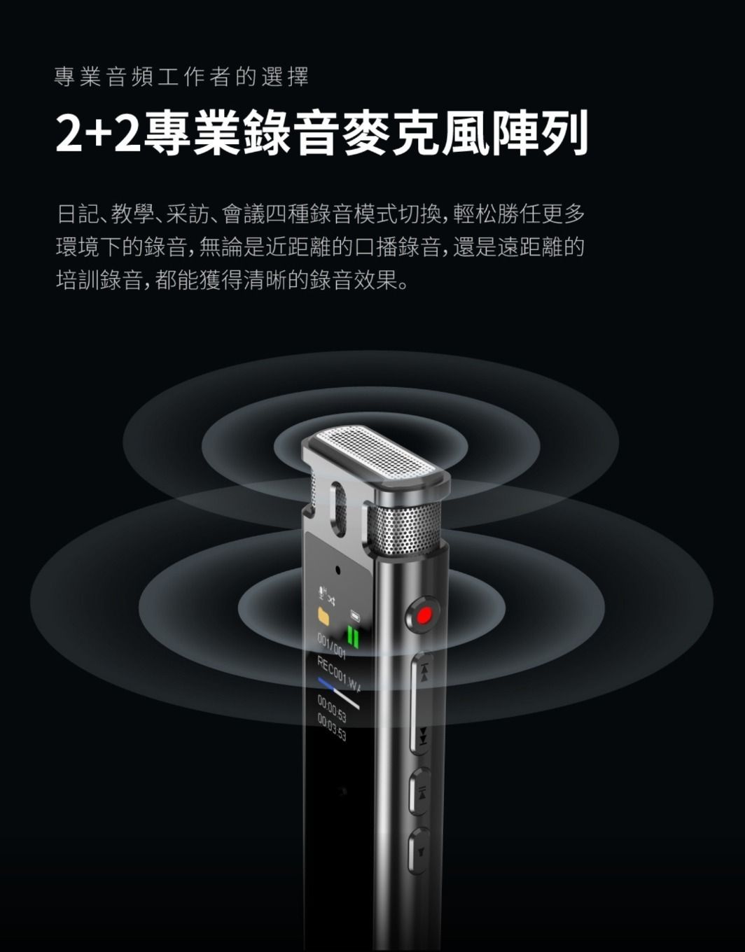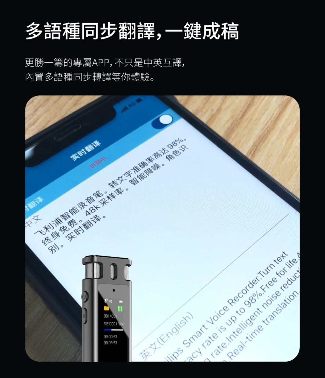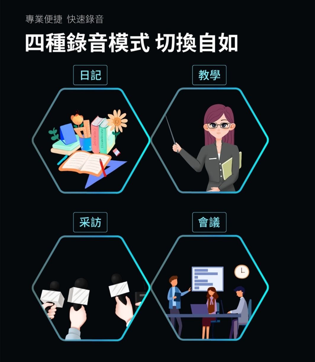 四種錄音模式選擇內置可充電鋰電池通過藍牙連接,手機APP,編輯方便中英文翻譯。