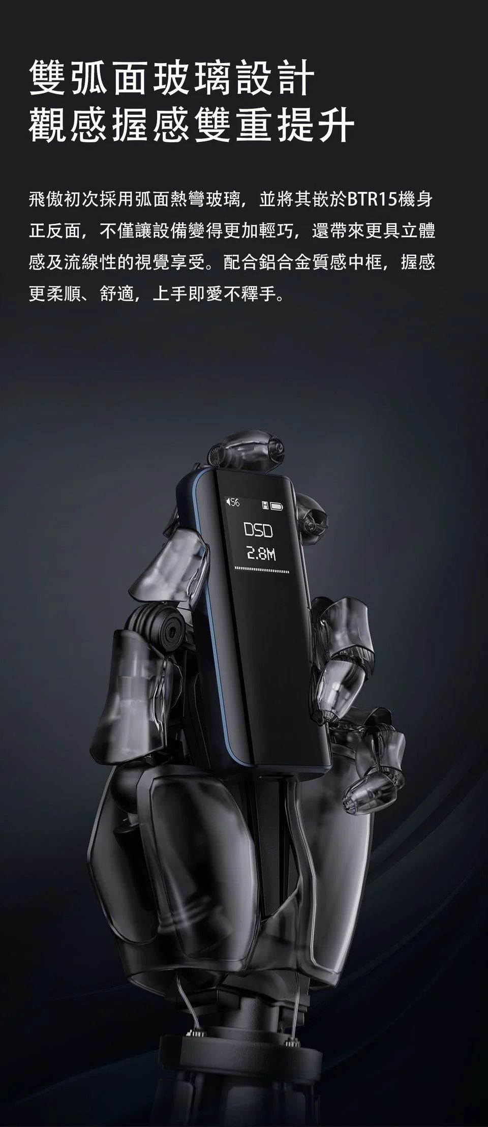 飛傲初次採用弧面熱彎玻璃,並將其嵌於BTR15機身正反面,不僅讓設備變得更加輕巧,還帶來更具立體感及流線性的視覺享受。配合鋁合金質感中框,握感更柔順、舒適,上手即愛不釋手。