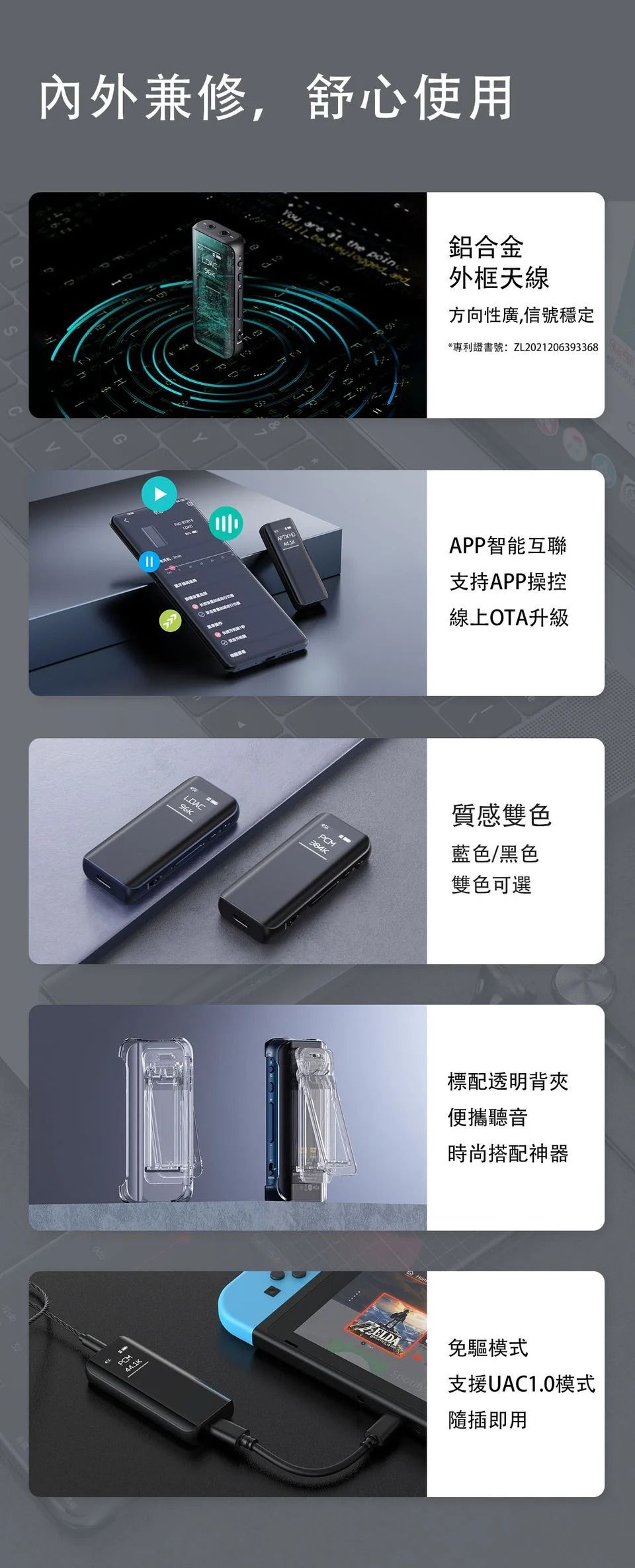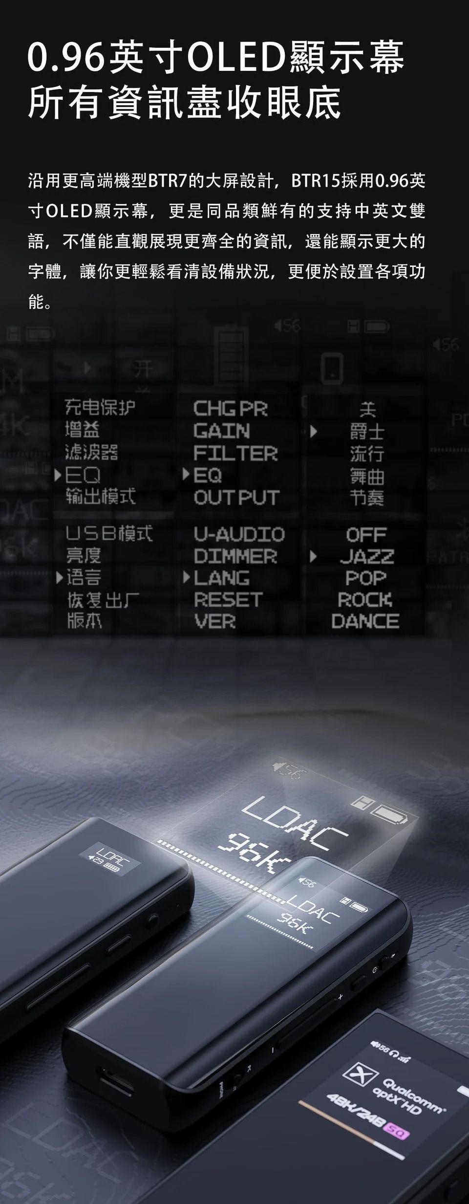 新升級從“芯”出發,BTR15選用高通QCC5125藍牙晶片 + XMOS 16核芯 XU316的高能組合,在各種模式*下都能進行穩定的高清音訊廣播,讓你沉醉于高品質HiFi音樂的世界。 取樣速率支持: *BT檔,支援LDAC/aptX adaptive/aptX LL/aptX HD/aptX/AAC/SBC等高清藍牙編碼,藍牙解碼取樣速率高達96kHz; *PC/PHONE檔,非同步音訊解碼,支援384kHz/32bit以及DSD256的無損音訊解碼。
