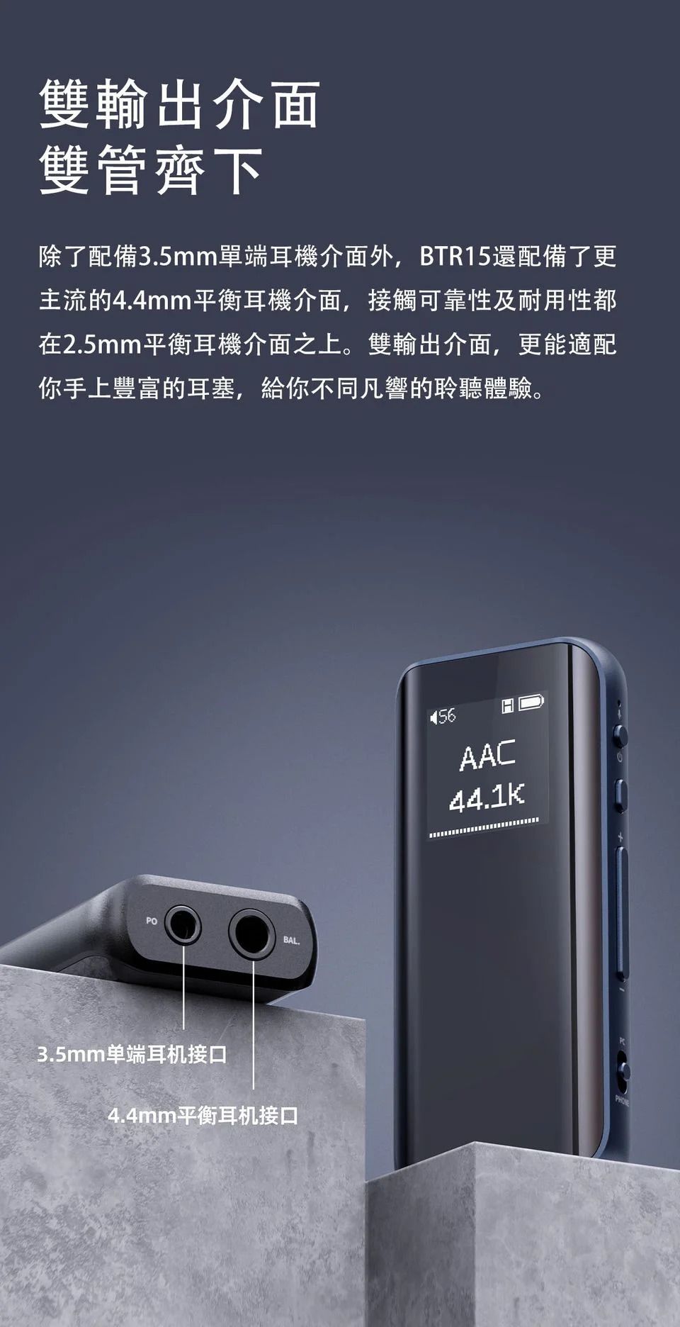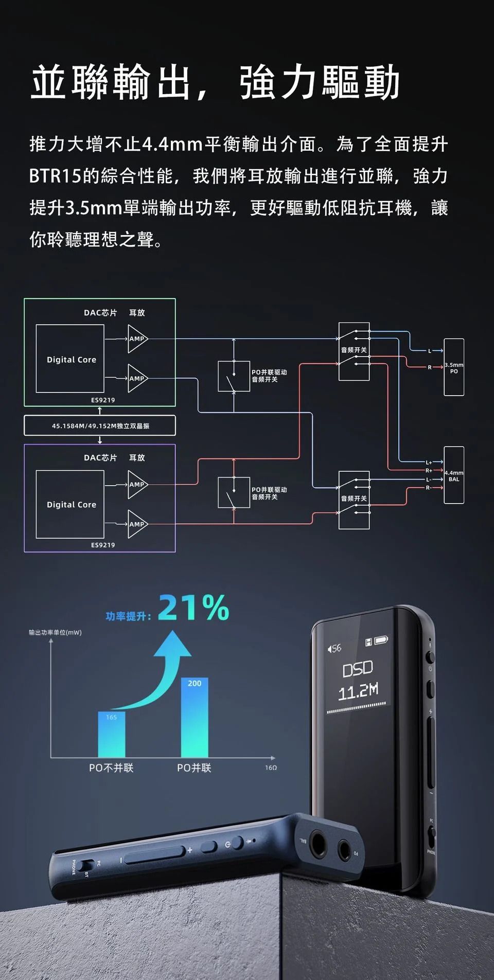 推力大增不止4.4mm平衡輸出介面。為了全面提升BTR15的綜合性能,我們將耳放輸出進行並聯,強力提升3.5mm單端輸出功率,更好驅動低阻抗耳機,讓你聆聽理想之聲。