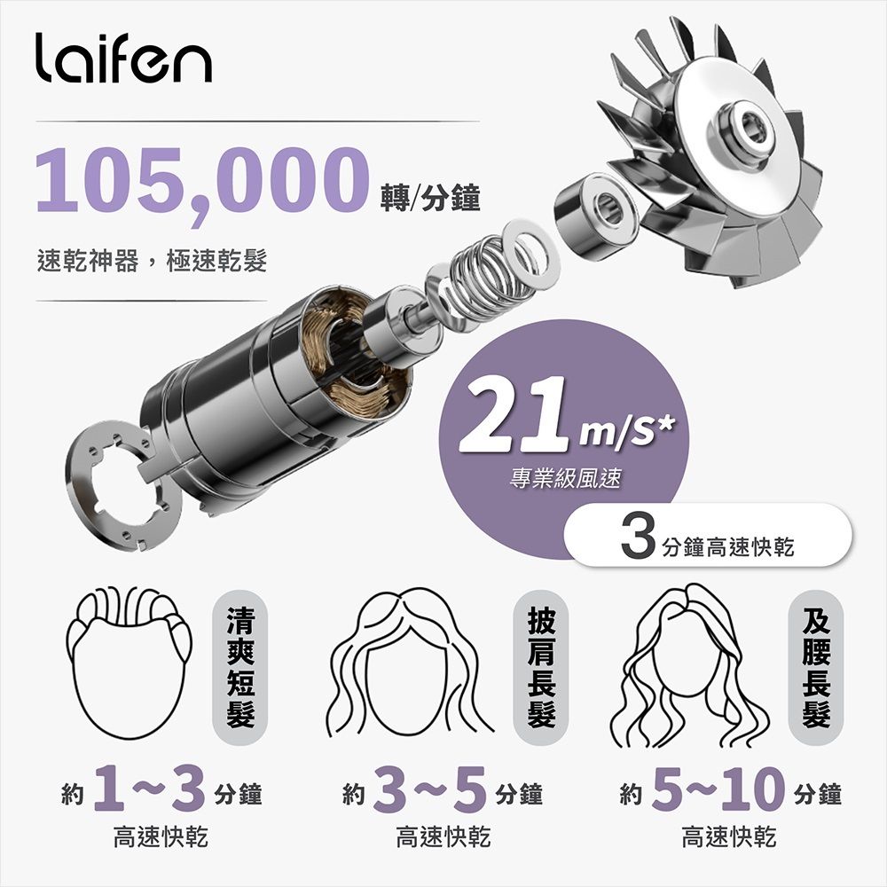 • 「3分鐘」快速乾髮 - 105,000轉高速無刷摩打,強力氣流可以在短時間內吹乾頭髮