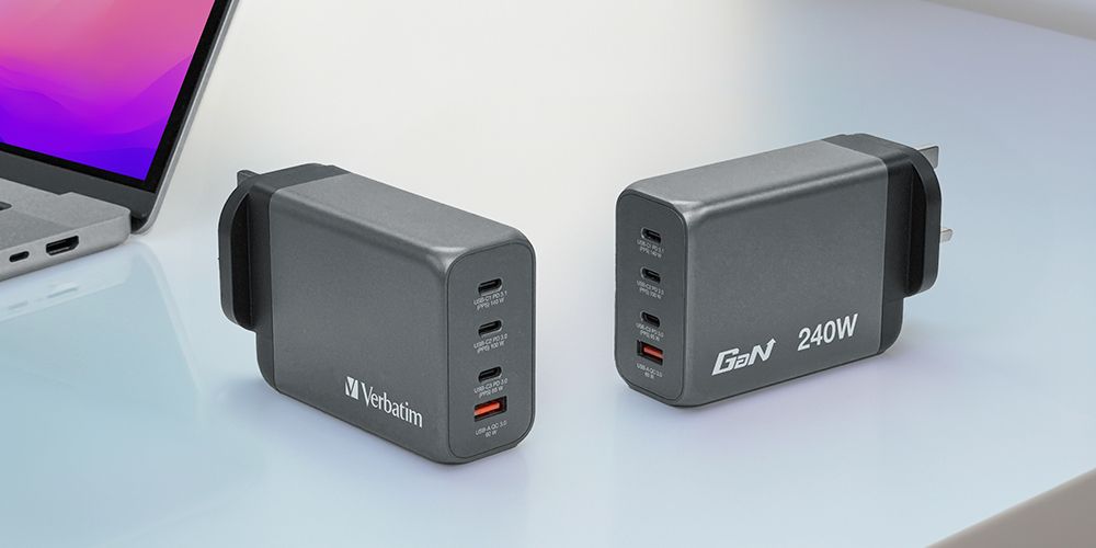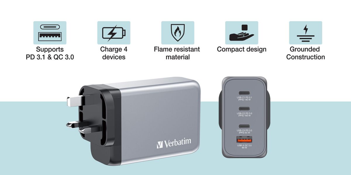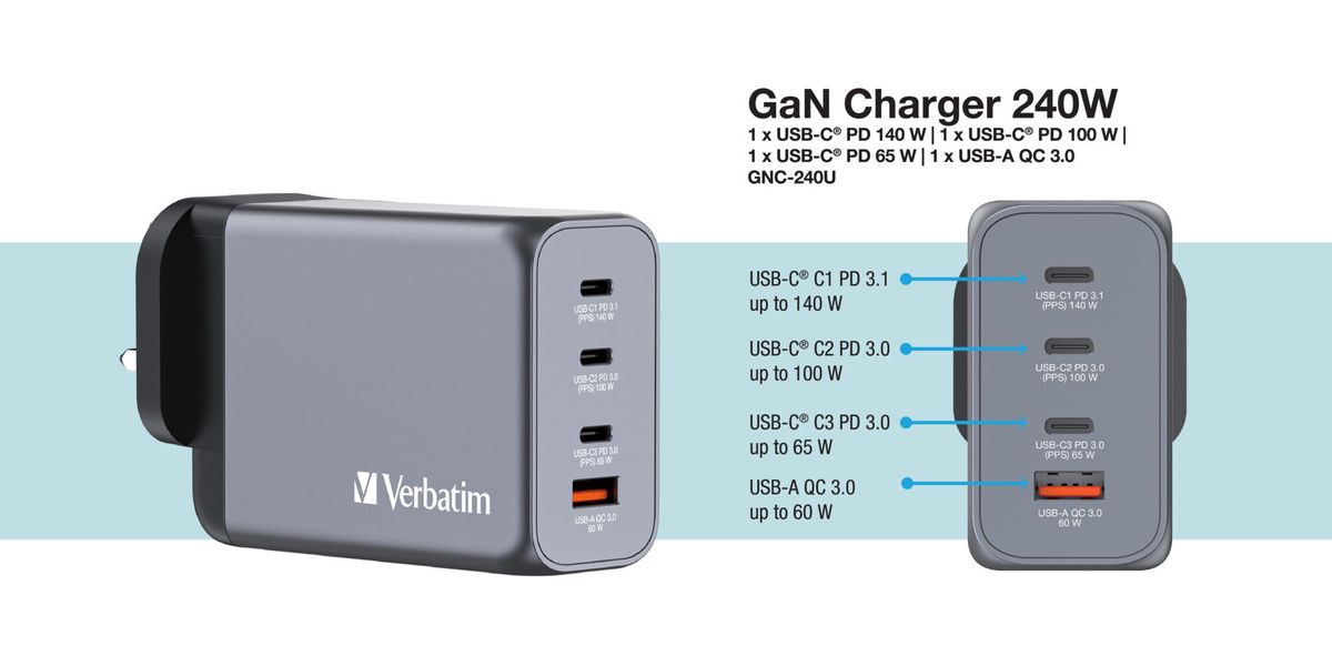 Verbatim的240W GaN插牆式充電器配備一個USB-C PD 140W端口、一個USB-C PD 100W端口、一個USB-C PD 65W端口和一個USB-A QC 3.0端口,外形小巧,非常適合辦公室或家庭使用,可為手提電腦、平板電腦、智能手機、遊戲設備等提供足夠電源。