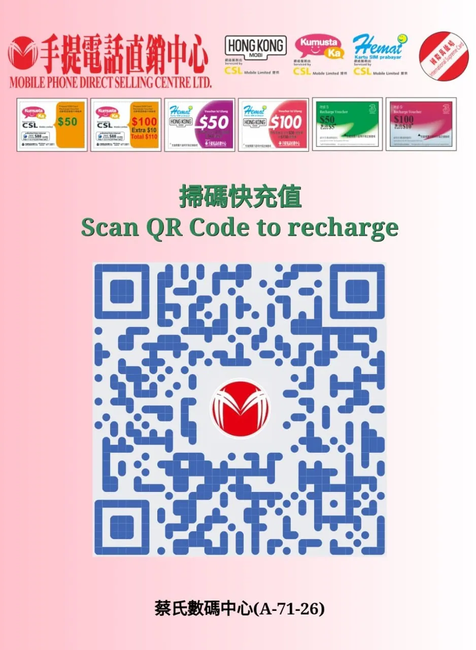 如需在非本店辦公時間增值,請使用以下QR CODE自助增值(24小時自助增值(3萬能卡、Hemat/HKmobile、CSL適用),手機相機掃code後入電話號碼再付款,最少增值$50)